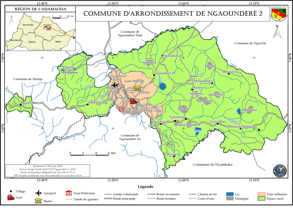 Située à 13,5961° de longitude Est et 7,3551° de latitude Nord, dans le Département de la VINA, Région de l’Adamaoua, la Commune d’arrondissement de Ngaoundéré 2ème, a une superficie d’environ 1630km².